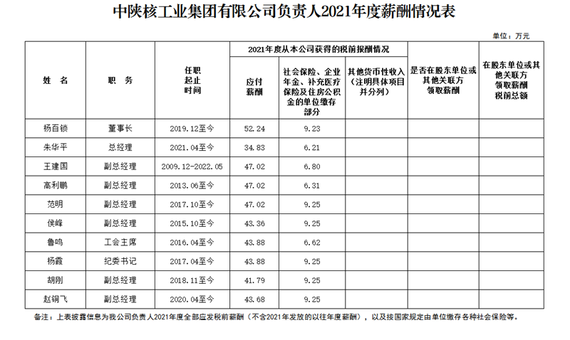 中陜核工業(yè)集團(tuán)有限公司負(fù)責(zé)人2021年度薪酬情況表
