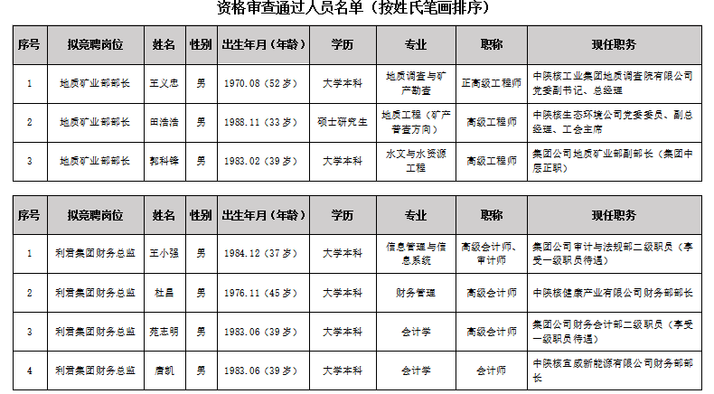 根據(jù)《中陜核工業(yè)集團(tuán)有限公司關(guān)于部分中層管理崗位競聘工作的實(shí)施方案》有關(guān)要求,現(xiàn)對資格審查通過的報(bào)名人員予以公示。
