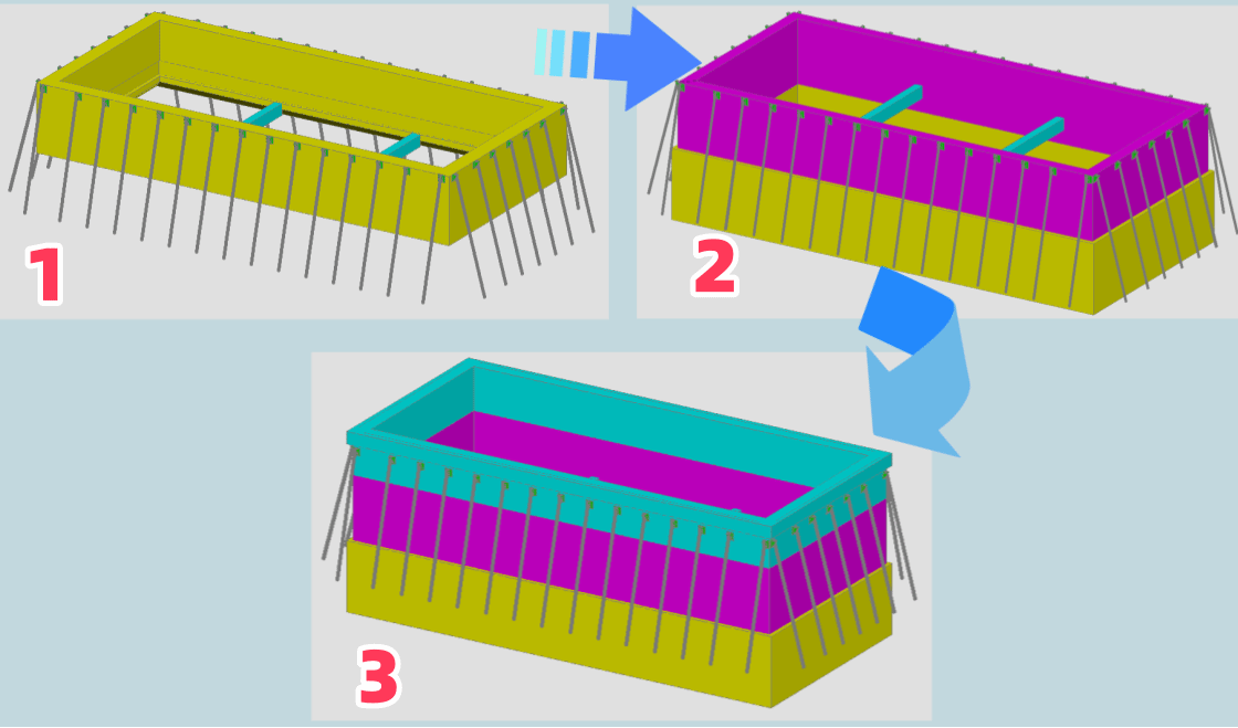 3.多功能錨索創(chuàng)新應(yīng)用:多點(diǎn)布置的反力錨索在結(jié)構(gòu)下沉過程提供下壓力,并滿足了結(jié)構(gòu)最終姿態(tài)調(diào)平精準(zhǔn)控制的要求;通過耐久性處理的錨索可在硝鹽槽基礎(chǔ)運(yùn)營使用過程中提供水平力限制結(jié)構(gòu)變形,并兼做抗浮錨桿防止深基礎(chǔ)上浮。