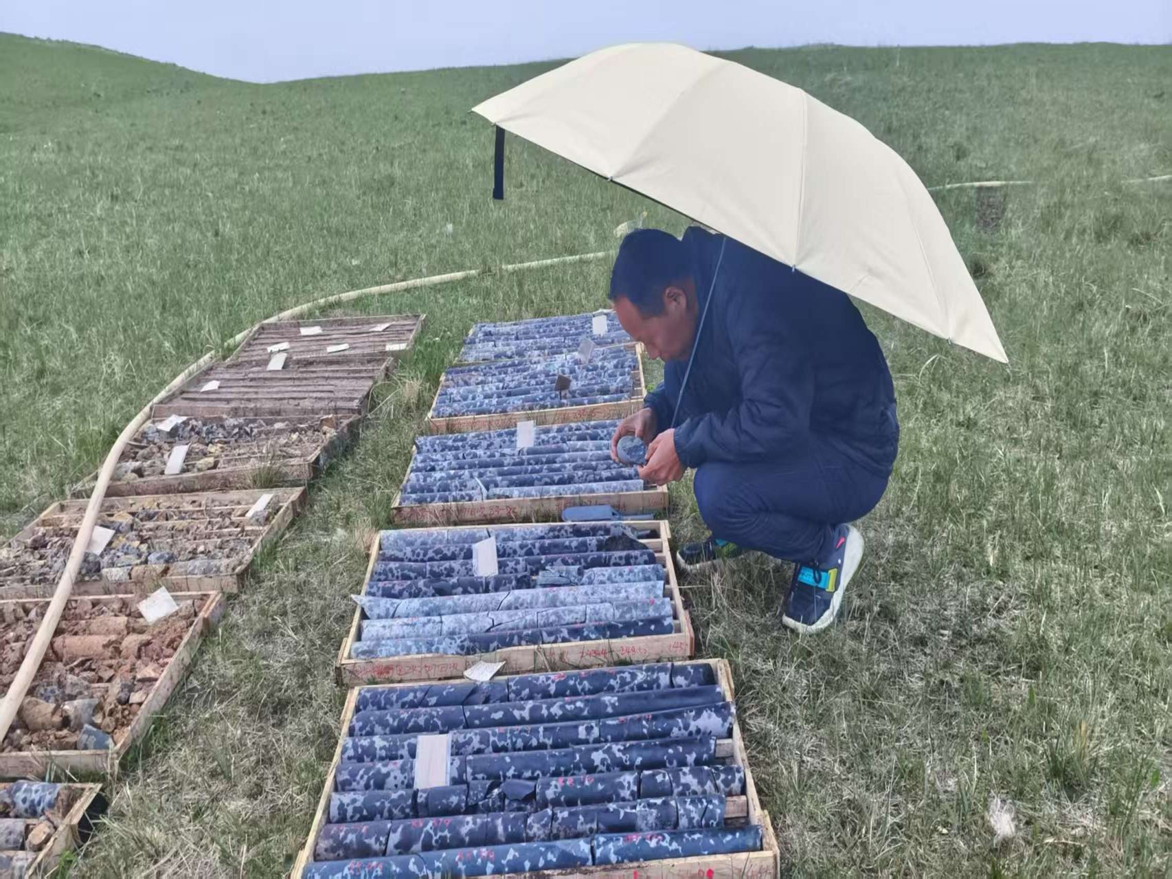 這支隊(duì)伍已經(jīng)在這兒待了半年,主要負(fù)責(zé)兩個(gè)礦區(qū)項(xiàng)目的設(shè)計(jì)、打鉆、編錄和取樣工作。每天天剛亮,鉆機(jī)就啟動(dòng)了,轟隆轟隆的聲音在草原上響個(gè)不停,蓋過了遠(yuǎn)處游客們嬉鬧的聲音。
