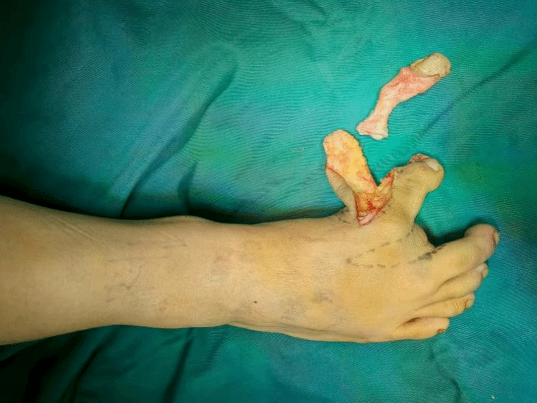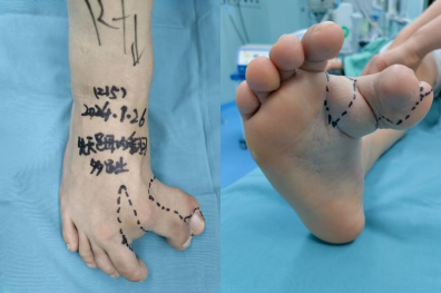 手術(shù)開始便迎來了第一個(gè)挑戰(zhàn),由于畸形足趾的血管走行常異于常人,術(shù)中一旦損傷趾動(dòng)脈,將導(dǎo)致足趾缺血壞死,造成災(zāi)難性后果。為此,團(tuán)隊(duì)術(shù)前特意為患足做了血管彩超,精準(zhǔn)繪制出“血管地圖”,從而在手術(shù)中完美避開了重要血管,確保了術(shù)后足趾的血運(yùn)安全。