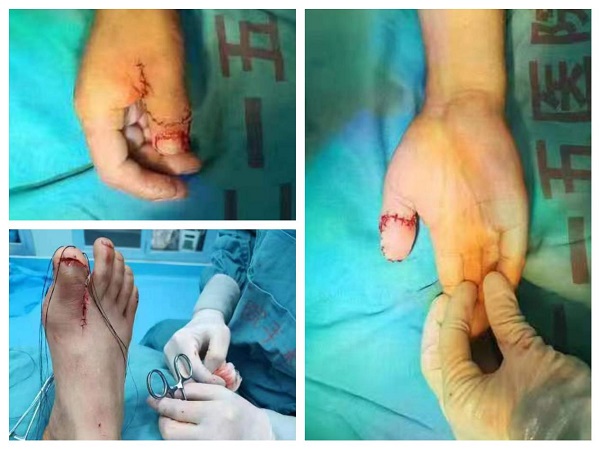 手術(shù)難度大,風(fēng)險高,在蔣宏魁主任團隊縝密的手術(shù)方案保障下,根據(jù)右手拇指缺損大小、形態(tài),設(shè)計移植的趾體,在顯微鏡下“飛針引線”,周偉龍主管醫(yī)生完美的術(shù)中配合,經(jīng)過皮瓣切除分離、縫合血管、神經(jīng)等一系列精細操作后,歷時6小時,手術(shù)圓滿完成。