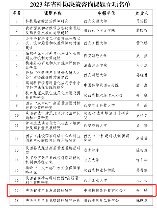 近日,陜西省科學(xué)技術(shù)協(xié)會公布了2023年度陜西省科協(xié)決策咨詢課題立項結(jié)果(陜科協(xié)發(fā)〔2023〕宣字14號),核盛公司總經(jīng)理張鵬博士獲批省科協(xié)決策咨詢課題1項,這是今年以來核盛公司第4個省級項目立項,公司的科研綜合...