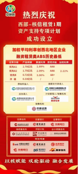 近日,由陜核投資所屬子公司陜核租賃作為原始權(quán)益人的“西部-核信租賃1期資產(chǎn)支持專項計劃”成功發(fā)行,總規(guī)模達(dá)5.5億元,加權(quán)平均票面利率為2.11%。此次發(fā)行是陜核租賃繼2024年首次亮相資本市場后的又一融資舉措,加權(quán)平均票面利率創(chuàng)下西北地區(qū)融資租賃ABS歷史新低。 自2018年成立以來,陜核租賃在中陜核集團(tuán)和陜核投資的正確領(lǐng)導(dǎo)下,始終秉持產(chǎn)融結(jié)合的初心使命,堅持市場化運作與集團(tuán)內(nèi)部協(xié)同發(fā)展并重,緊扣租賃業(yè)務(wù)本源,積極拓展資本市場融資渠道,...