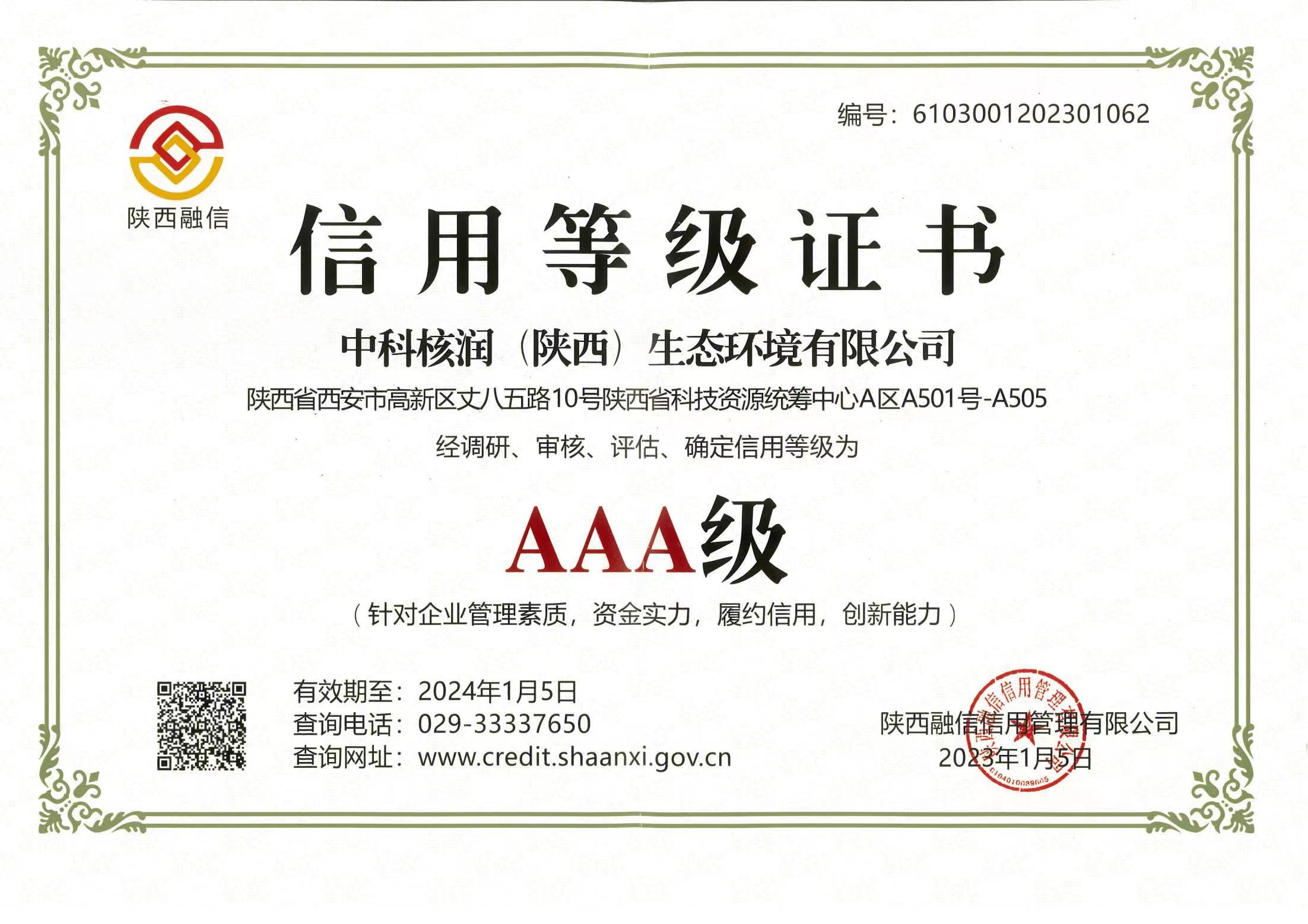 近日,中科核潤(陜西)生態(tài)環(huán)境有限公司經(jīng)陜西融信信用管理有限公司信用評價評審機構(gòu)嚴格考核審查,順利通過信用中國企業(yè)信用等級3A評級,被授予企業(yè)信用評價--《AAA級企業(yè)信用等級》證書。 此次3A信用等級評定工作...