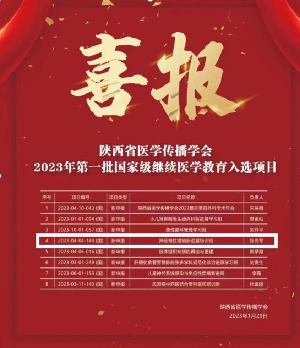 2023年1月28日,從國家繼續(xù)教育項目中心傳來喜訊,二一五醫(yī)院申報的國家級繼續(xù)教育項目《神經(jīng)脊柱微創(chuàng)新進(jìn)展培訓(xùn)班(項目編號2023-04-04-149(國)》被批準(zhǔn)為2023年第一批國家級繼續(xù)醫(yī)學(xué)教育項目,這是二一五醫(yī)院脊柱...