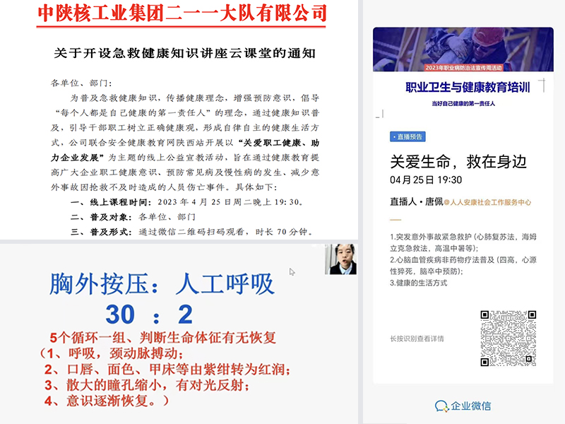 為普及急救健康知識,傳播健康理念,增強預防意識,倡導“每個人都是自己健康的第一責任人”的理念,4月25日,二一一大隊有限公司聯(lián)合安全健康教育網(wǎng)陜西站開展以“關愛職工健康、助力企業(yè)發(fā)展”為主題的線上公益宣教...